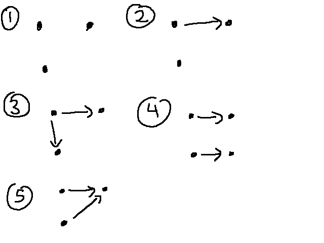 However, notice that the condition in the hypothesis (\(xRy\) and \(y R z\)) is very specific. When we have any other configuration of arrows, the if/then statement is vacuously true. So all of the following local situations are consistent with the relation being transitive: