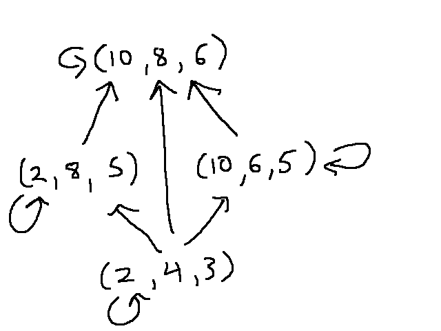 Notice that (10,8,6) is definitely better than (2,8,5), (2,4,3), and (10,6,5). However, our definition doesn't state whether (2,8,5) is better or worse than (10,6,5). And that's what we want for our application, because it's genuinely not clear whether extra charm is better than extra strength. These missing relationships are what makes this a "partial" order, as compared to a "total" or "linear" order like \( \le\) on the real numbers.