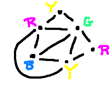 In graph coloring, we need to put a color on each node, with the rule that adjacent nodes may not have the same color. Here's a graph and one way to color it with four colors: