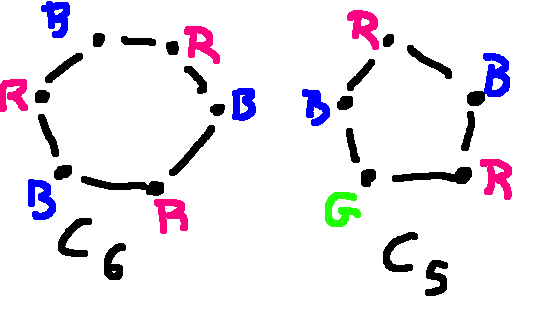 Wheel graphs are similar, except that an extra color is needed for the node in the middle. Notice that \(W_n\) has n+1 nodes.