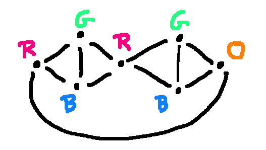 Notice that this partial coloring cannot be completed using only four colors, since b and f are adjacent to one another and also adjacent to nodes with R, G and B. The plan needs to be reworked a bit to finish with only four colors and it's helpful to remember how to color the Moser spindle.