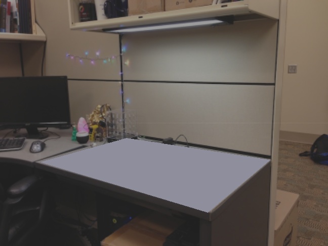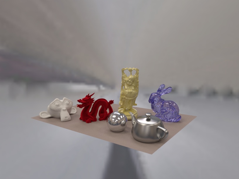 My rendered scene is down below; as you can tell, this is not quite the final result. To seamlessly insert the objects, we need to follow the compositing procedure outlined by Debevec (Section 6 of the paper). This requires rendering the scene twice (both with and without the inserted objects), and creating an inserted object mask.
