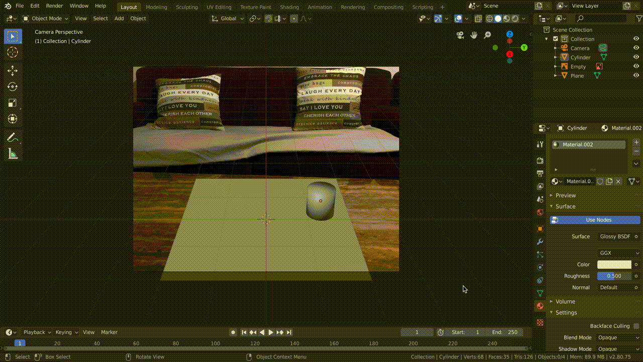 To generate the image, you need to render. First, you set the Render Engine to Cycles using the Render Properties (icon looks kind of like a clipboard or tv). Set the Sampling Render number to 1000 (lower for speed, higher for quality). For your final scene composite, you'll render once with all the objects, once with only the supporting plane, and one more time to generate the object masks. Make sure to save your complete scene before modifying your scene for these different renderings.