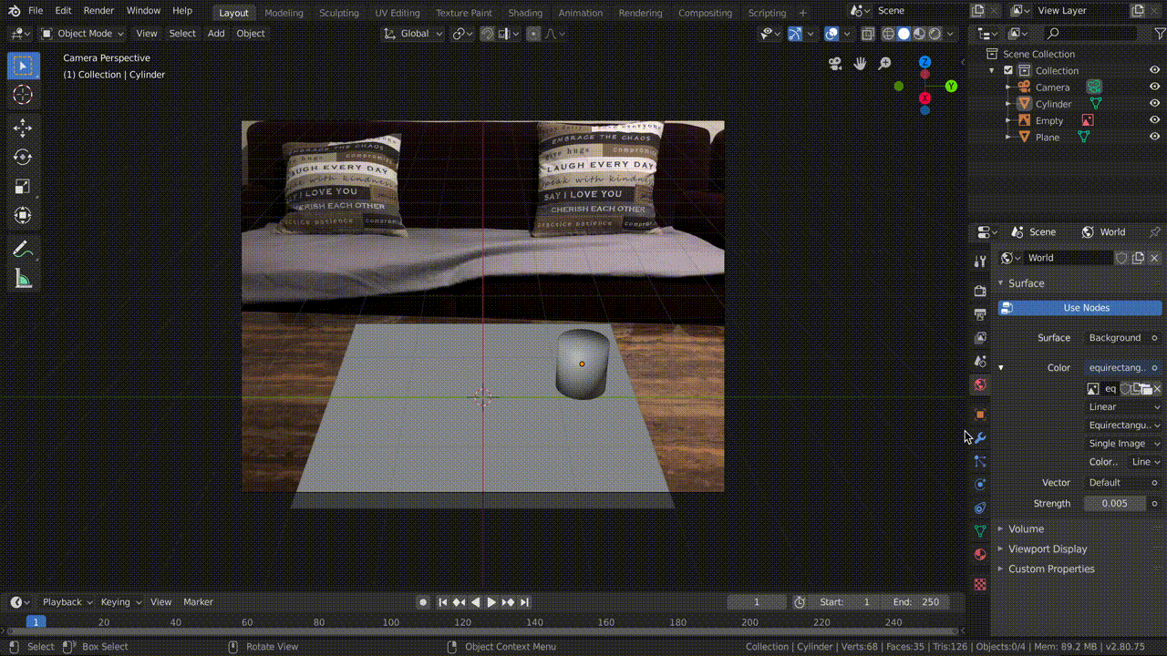 Then, add your equirectangular HDR image that you generated in your Jupyter Notebook: write_hdr_image(eq_image, 'equirectangular.hdr').