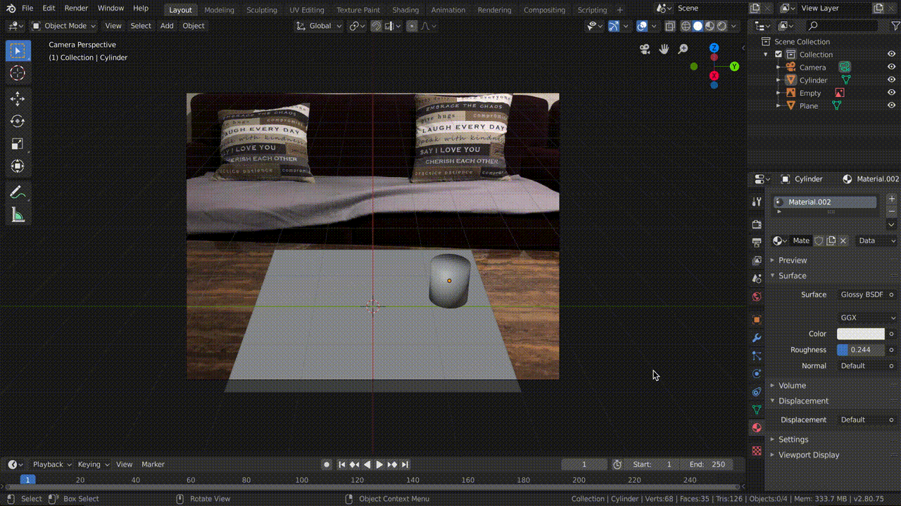 Finally, insert synthetic objects into the scene. There are basic models in Blender, and you can find others online: Turbosquid, Google 3D Warehouse, DModelz, etc. Add interesting materials to your inserted objects as well. Once finished, your scene should now look something like the right image below.