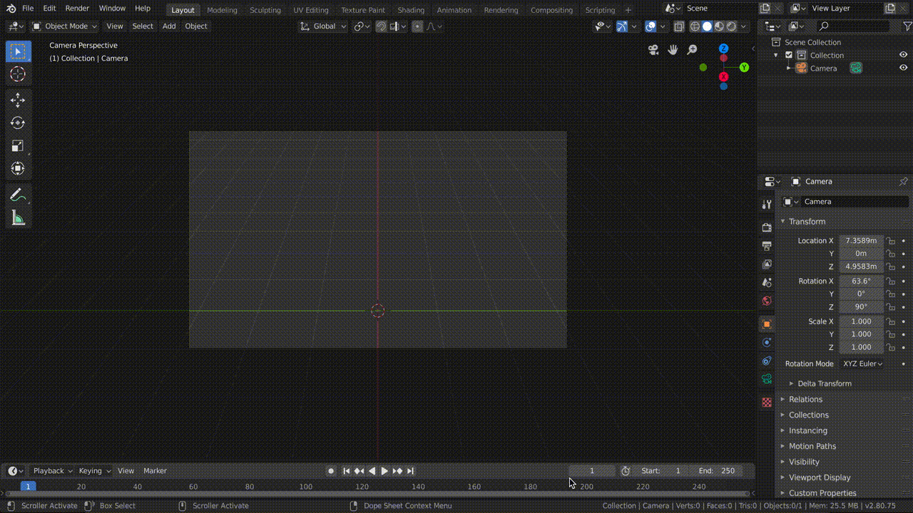 First clear out initial scene including sample mesh and lighting, and setup camera position