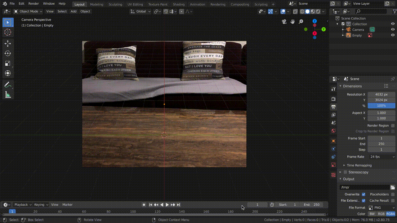 Blender scene after: loading background image, modeling local scene, inserting objects