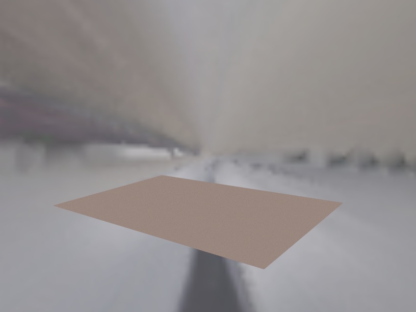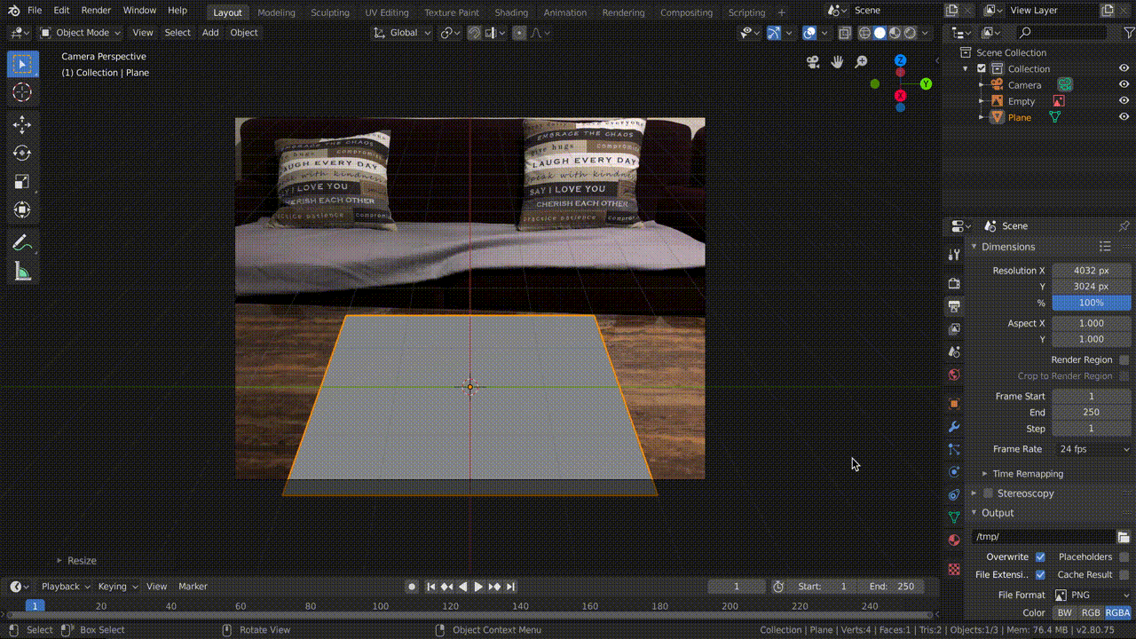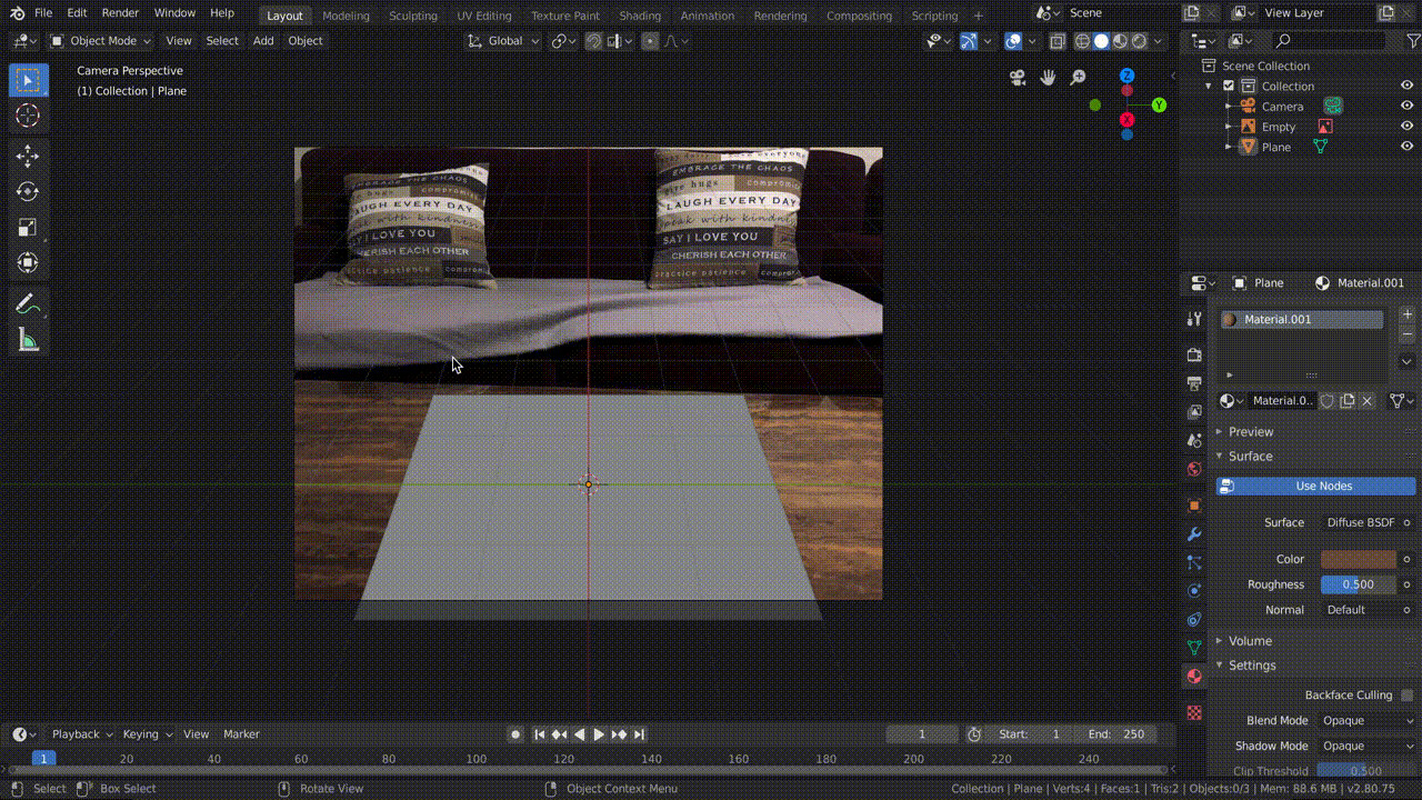 Then, we want to add local scene. That is, add simple geometry (usually planes suffice) to recreate the geometry in the scene near where you'd like to insert objects. For best results, this should be close to where you placed the spherical mirror. Feel free to use the sample scene provided and move the vertices of the plane to match the surface you'd like to recreate (ignore the inserted bunny/teapot/etc for now). Once you're happy with the placement, add materials to the local scene: select a piece of local scene geometry, go to Properties->Materials, add a Diffuse BSDF material, and change the "Color" to roughly match the color from the photograph.