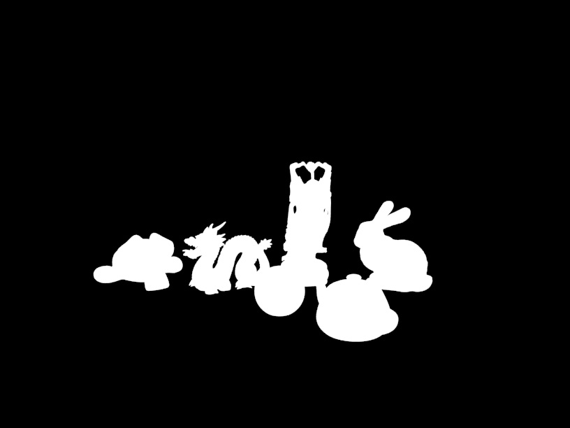 Finally, we need to create an object mask. The mask should be 0 where no inserted objects exist, and greater than 0 otherwise. First, create another duplicate of your scene and open it up (e.g. ibl-mask.blend). We can create the mask quickly using Blender by manipulating object materials and rendering properties: