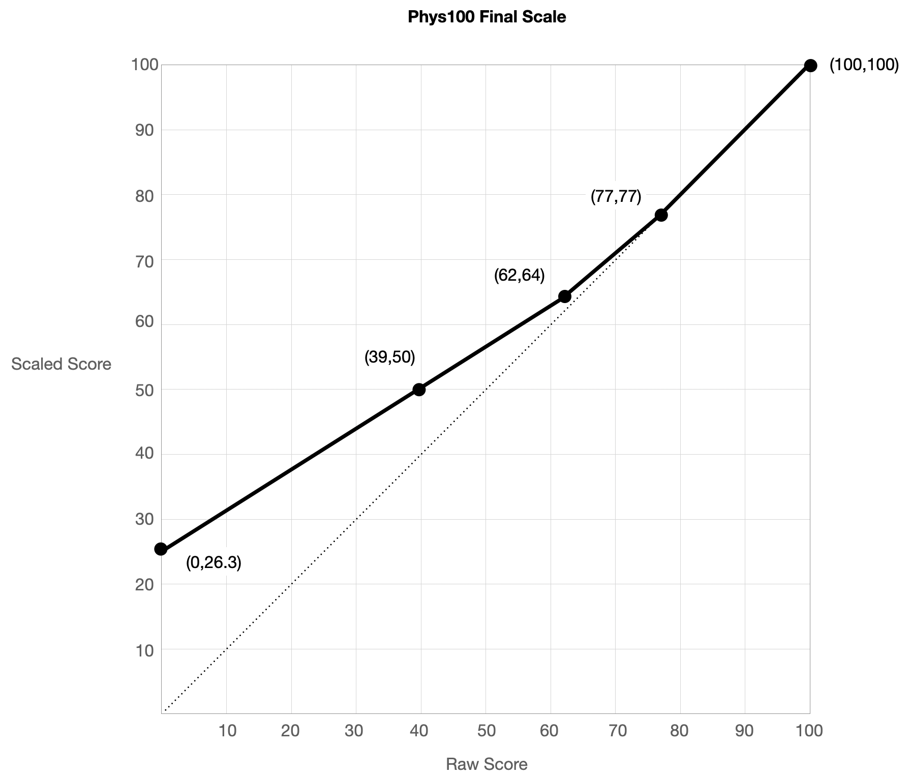 Final grades are now posted in the gradebook. There is an exam 2 score and an exam 2 scaled score, along with your final course letter grade. The scaled score is computed using the scale shown in the graph below, and this is what goes into the final grade calculation. Bonus points were added to your point total out of 1000 points.