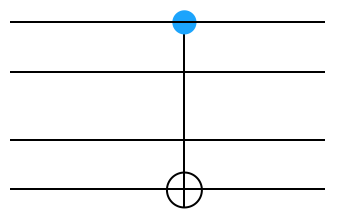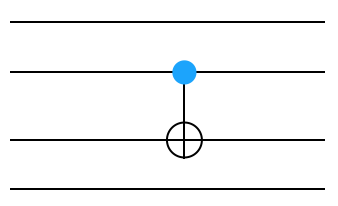 A challenge: We’ve figured out how to construct CNOT gates that apply to neighboring wires. But what happens if the controlled bit is further away from the controlling bit (say between wires 1 and 3), like such: