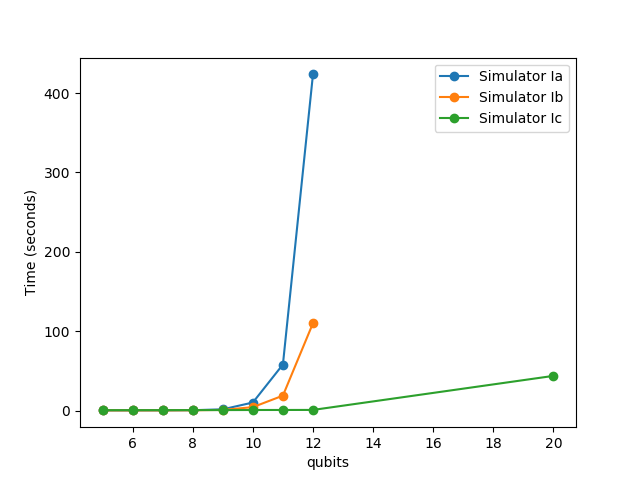 Make a plot of the result like below and add it to your document. Do the same thing with the RAM (use top or activity monitor to view the ram usage. You just need to get an approximation). Here we show the results for simulators I(abc)