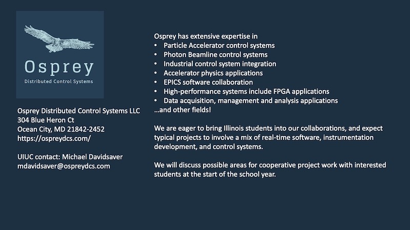 A typical project will comprise a suite of sensors managed by a microcontroller that transmits data over a radio link to a base station. Supervised by UIUC faculty, students will design and build their device's circuit and printed circuit board. They will write data acquisition, calibration, and offline analysis code. Students will fabricate parts as necessary on 3D printers. Oral presentations̶ at mid-year, then at project completion, will be complemented by a detailed technical report upon conclusion of the project.