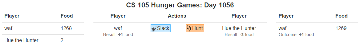 When you submit your solution, your solution will become part of the course-wide CS 105 Hunger Games! The CS 105 server is continuously running The Game, starting a new Game as soon as the old one finishes. This means you will get to test your skill and wit aganist all of the other studnets and staff of CS 105!