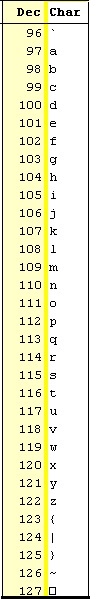 data.cleartext holds a String.Step 2: Get the ASCII code for each character in the messageWe have not discussed ASCII representation yet, but it is really simple, so don't worry. Basically it is a way for the computer to think of every letter (and other characters) as a number. For this lab we only use lower case letters, so we only use ASCII values of 97 (a) through 122 (z). Check out the table on the right! You can get this value using the charCodeAt() function like so data.cleartext.charCodeAt(position). Note that since we are passing the character's position to a function, it is in parentheses (), not index brackets [].