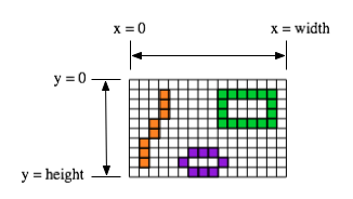 A graphics context draws in a rectangle made up of pixels. A position in the rectangle is specified by a pair of integer coordinates, (x,y). The upper left corner has coordinates (0,0). The x coordinate increases from left to right, and the y coordinate increases from top to bottom. The illustration shows a 16-by-10 pixel component (with very large pixels). A small line, rectangle, and oval are shown as they would be drawn by coloring individual pixels. (Note that, properly speaking, the coordinates don't belong to the pixels but to the grid lines between them.)
