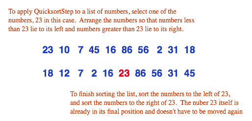 The Quicksort algorithm is based on a simple but clever idea: Given a list of items, select any item from the list. This item is called the pivot. (In practice, I'll just use the first item in the list.) Move all the items that are smaller than the pivot to the beginning of the list, and move all the items that are larger than the pivot to the end of the list. Now, put the pivot between the two groups of items. This puts the pivot in the position that it will occupy in the final, completely sorted array. It will not have to be moved again. We'll refer to this procedure as QuicksortStep.