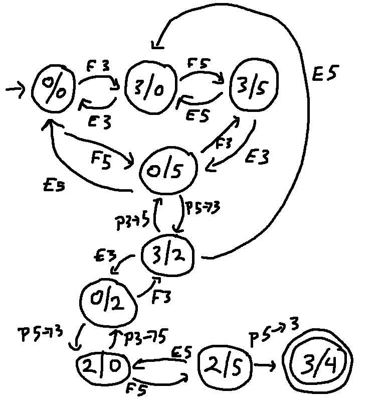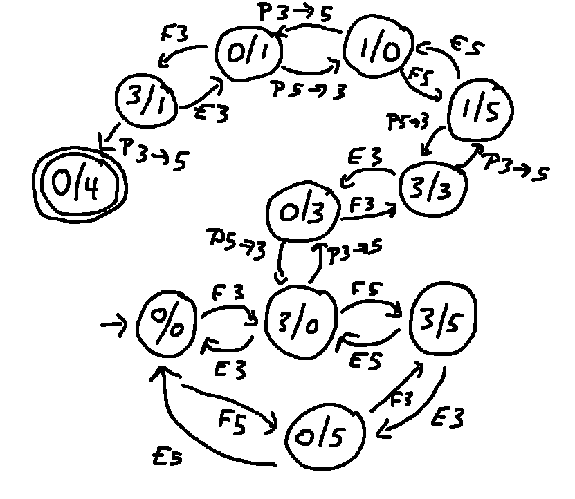 Here's the rest of the states and actions involved in one solution to the problem. Notice that the final state 3/4 is shown with a double circle.