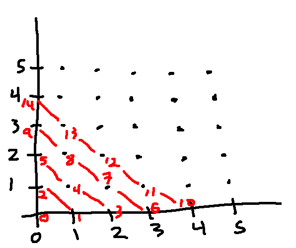 Now let's number them in diagonal groups. (0,0) gets the number 0. Then (1,0) and (0,1) are numbered 1 and 2. Then (2,0), (1,1), and (0,2) are numbered 3, 4, and 5. And so forth.