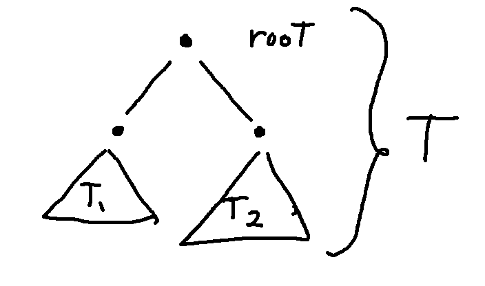 Dividing at the root ensures that we have a simple situation to analyze, in which both subtrees (\(T_1\) and \(T_2\)) are llama trees. This is frequently not the case if you improvise other ways to divide up T. So do not try removing a leaf, or the bottom level of the tree, or the like.
