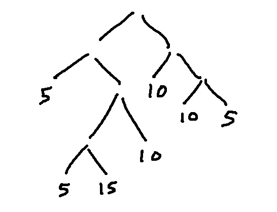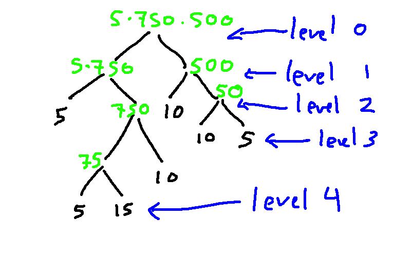Here's a partly-built llama tree with values on the leaves. Notice that the tree isn't at all symmetric and many of the branches don't go down to the bottom level. We have a free choice of whether each node should have children and what label to put on each leaf.