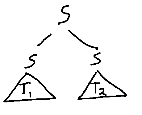 Case 1: T consists of a root labelled S and two subtrees (\(T_1\) and \(T_2\)) with roots labelled S.