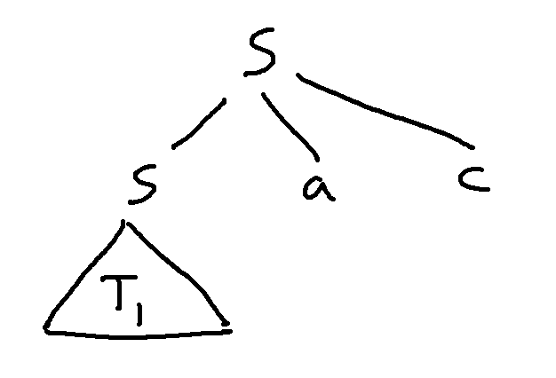Case 2: T consists of a root labelled S. It has a child subtree (\(T_1\)) with root label S, plus two children that are terminals a and c.