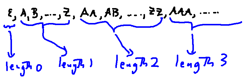 Let's look at a final example of a countable set. Suppose that M is a finite alphabet. To keep this concrete, let's suppose that M contains the set of uppercase letters. Recall that \(M^*\) is the set of all finite-length strings made from characters in M, including the empty string (\(\epsilon\)).
