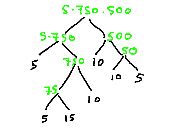 Here's a partly-built llama tree with values on the leaves. Notice that the tree isn't at all symmetric and many of the branches don't go down to the bottom level. We have a free choice of whether each node should have children and what label to put on each leaf.