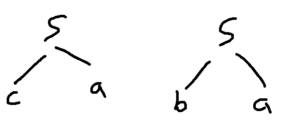 The trees below don't match this grammar. The root label on the lefthand one isn't a start symbol. One of the leaf labels in the middle one isn't a terminal symbol. And the righthand one has a node whose children don't match any of the rule patterns. The left-to-right order matters. So children labelled a,c,S doesn't match a rule pattern S,a,c.