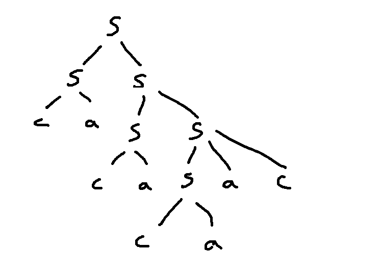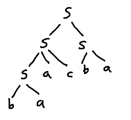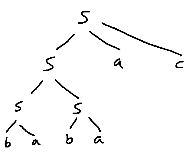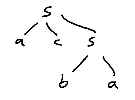 Case 2: T consists of a root labelled S. It has a child subtree (\(T_1\)) with root label S, plus two children that are terminals a and c.
