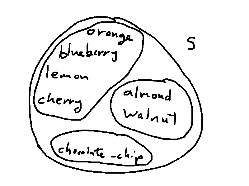 S = {{chocolate-chip},{ blueberry, orange, lemon, cherry}, {walnut, almond}}