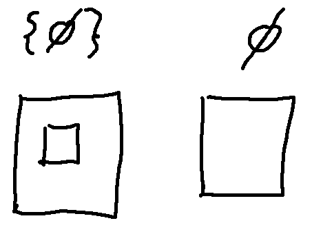 So what is \(\{\emptyset \}\)? This is a box containing the empty set, i.e. a box containing an empty box. The empty set is just a single empty box.