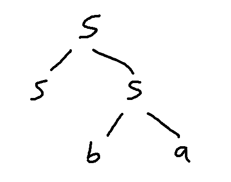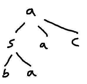 Case 2: T consists of a root labelled S. It has a child subtree (\(T_1\)) with root label S, plus two children that are terminals a and c.