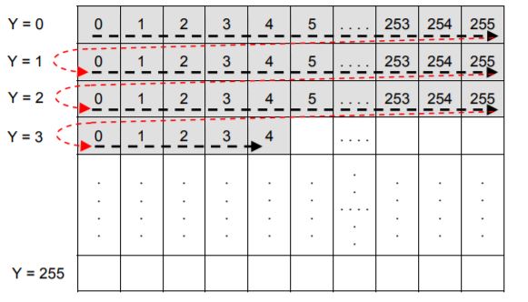 One way to traverse the image is in row first order. Figure below describes this Note that rows are being accessed one after the other. This is known as ‘Row First Traversal’. The graphic suggests that in the current iteration, x = 4 and y = 3 both starting from 0.