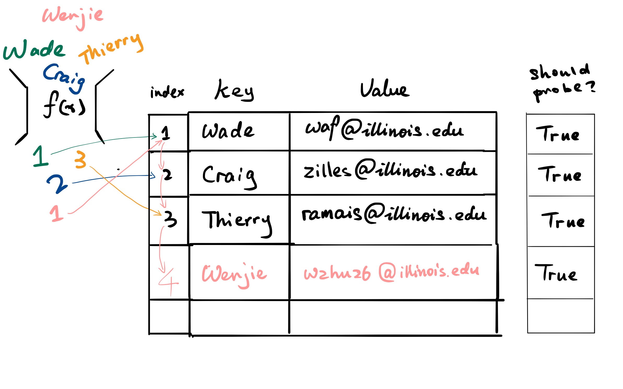 When we see a collision, we will try to linearly probe for next space. In our case, we should start to check slot 1, but oh waf is there, so let’s probe to slot 2. However, professor Craig has already taken that space so we need to probe again to slot 3 and found lovely Thierry there. Luckily, slot #4 is empty so we can put our TA’s info there.