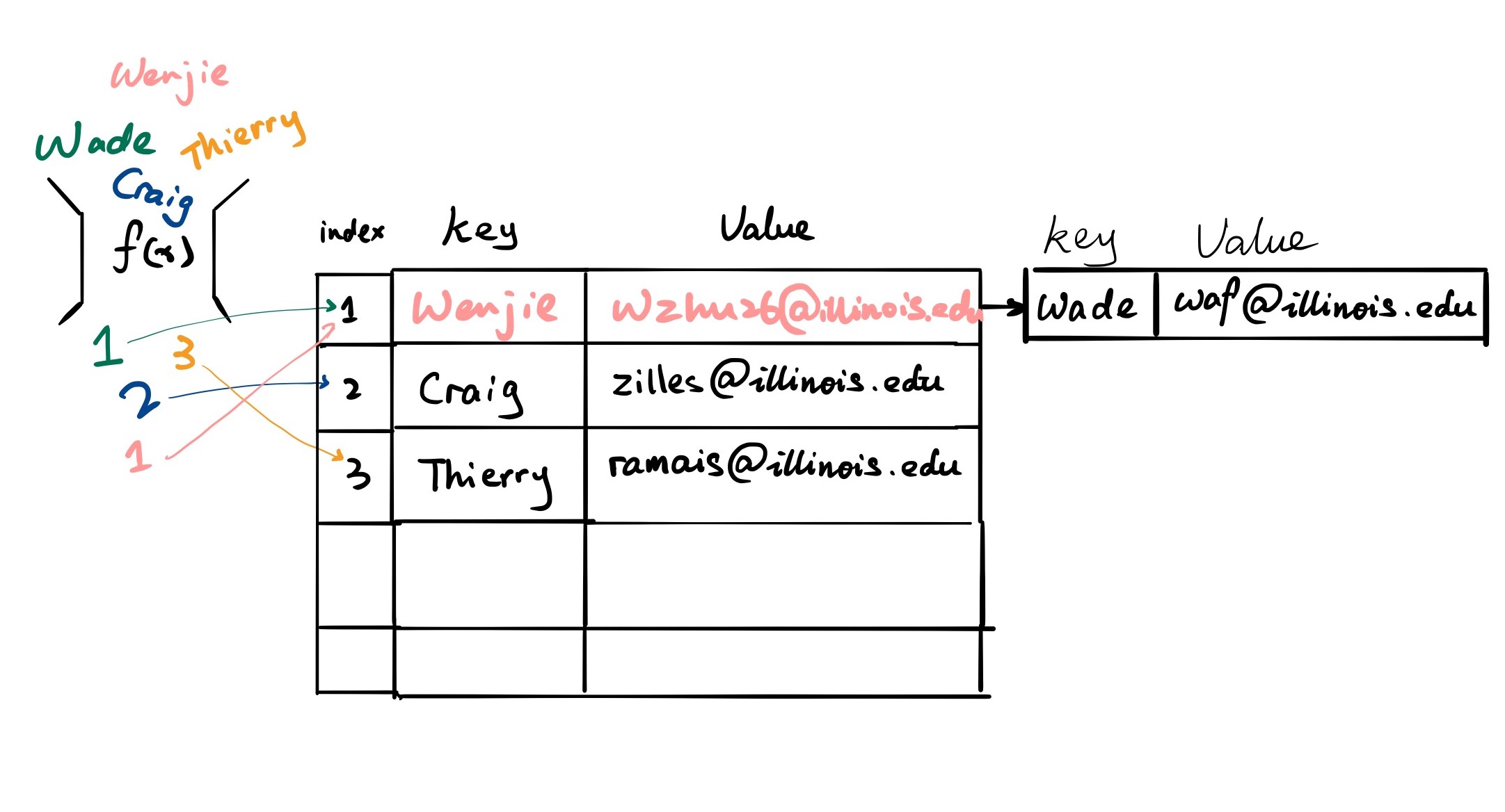 Now we want to insert a TA to our contact table, say key : Wenjie and value : wzhu26@illinois.edu. The hash function will return 1.