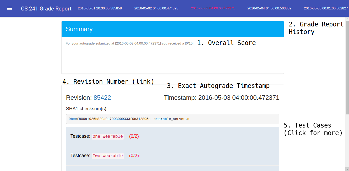 - Revision Number - The revision number that we autograded. This is a link that takes you to your code at autograde revision