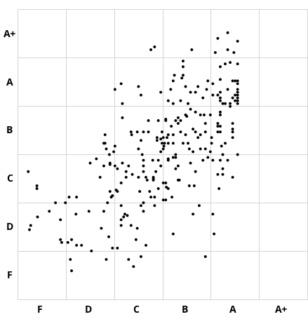 Please keep in mind that these letter grades are still very rough predictions of your final course grade, based on only 40% of your overall coursework. Past experience suggests that most students‘ final course grades will be within one letter grade of these estimates, but differences of up to a full letter grade (in either direction) are fairly common.