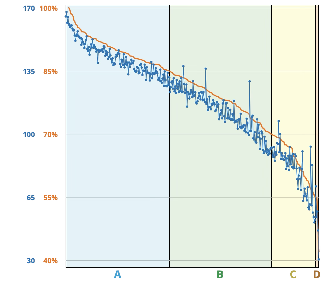 The orange curve shows the final overall course averages (see below) for all students who took all three regular exams and who submitted at least half of the homework, in sorted order. The blue dots show the sum of all three exam scores for the corresponding students. Dots further above the orange curve indicate lower homework averages.