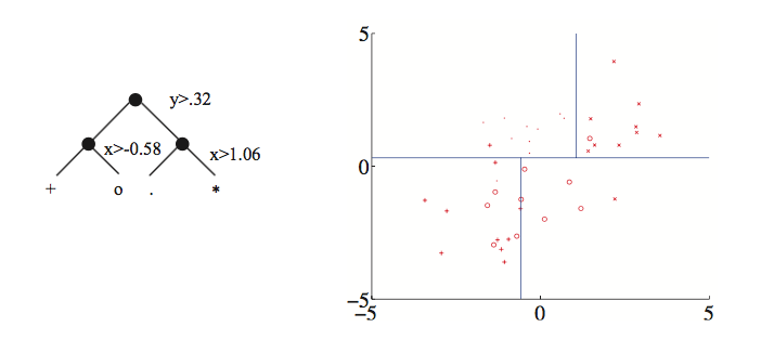 Each node of the tree represents a pool of examples. The pool at a leaf node may contain examples that all have the same output type, e.g. if you have asked enough questions. Or the pool may represent several output values, in which case the algorithm returns the answer that's most popular in the pool. (Compare the bottom output values in the tree above to what's in the four regions of the 2D plot.) This may happen when the input feature values can't fully predict the output label (see the plot of English vowels above), or when the user has imposed a limit on the depth of the tree.