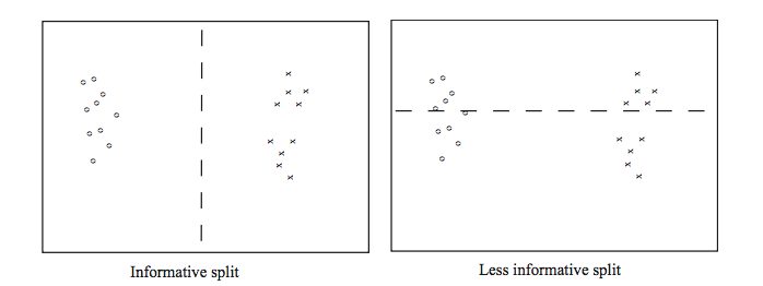 A good split must produce subpools that have lower entropy than the original pool. (See below on entropy.) Given two candidate splits (e.g. two thresholds for the same continuous variable), it's better to pick the one that produces lower entropy subpools.