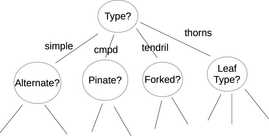 Depending on the application, the nodes of the tree may ask yes/no questions, forced choice (e.g. simple vs. complex vs. tendril vs thorns), or set a threshold on a continuous space of values (e.g. is the tree below or above 6' tall?). The output label may be binary (e.g. is this poisonous?), from a small set (edible, other non-poisonous,poisonous), or from a large set (e.g. all vines found in Massachusetts).