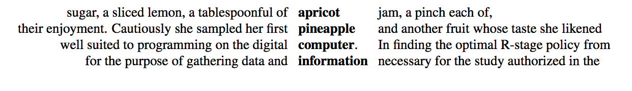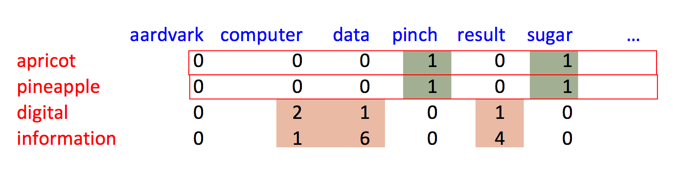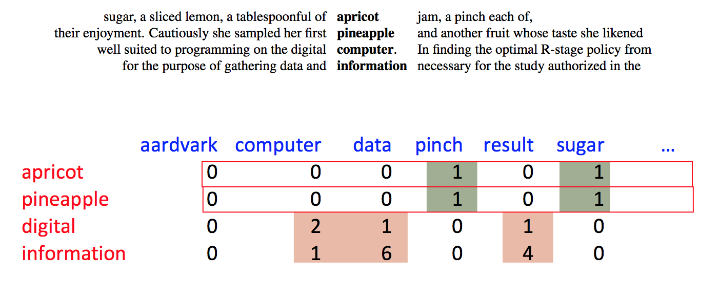 Alternative, we can use nearby words as context. So this example from Jurafsky and Martin shows sets of 7 context words to each side of the focus word. Our 2D data table will relate each focus word to each context word.