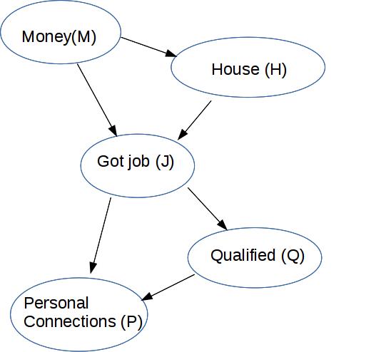 We'd like to use Bayes nets for computing most likely state of one node (the "query variable") from observed states of some other nodes. If we have information about the nodes at the top of the net, it's obvious how to compute probabilities for the state of nodes below them. However, we typically want to work from visible effects (e.g. money and house), through the intermediate ("unobserved") nodes, back to the causes (qualifications and personal connections).