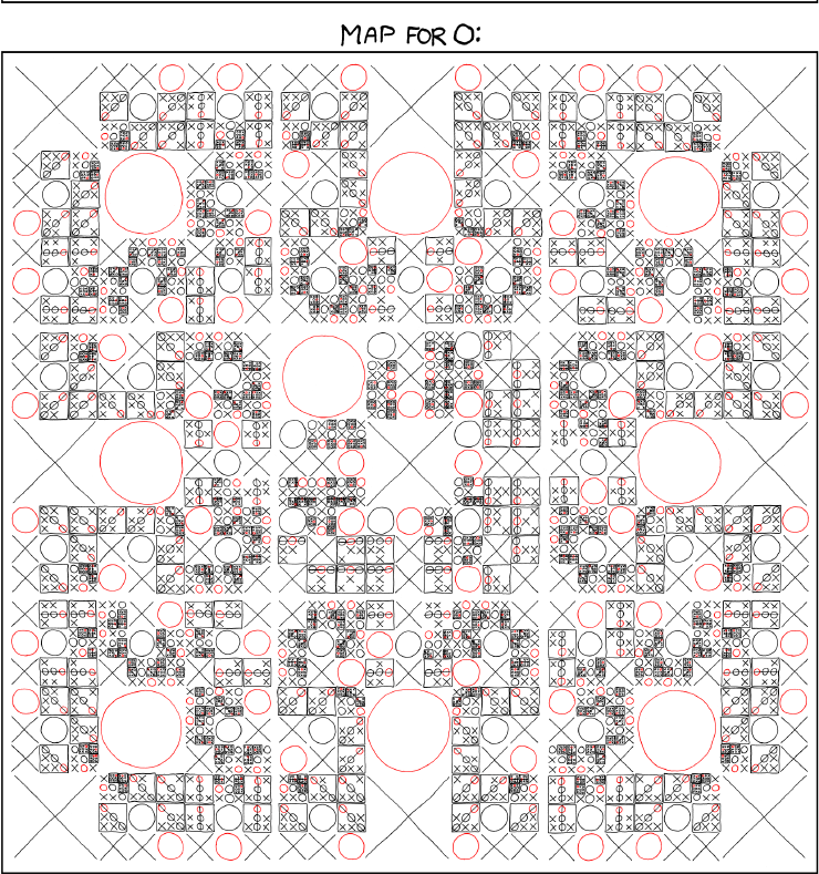 Tic-tac-toe is still simple enough that we can expand out the entire tree of possible moves, finding out that either player can force a draw. It's slightly difficult for humans to do this without making mistakes, but computers are good at this kind of bookkeeping. The first computer implementation was in 1952 on the EDSAC computer. Here's the details, compacted into a convenient diagram by the good folks at xkcd.