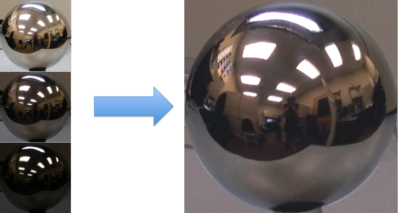 To the right are three pictures taken with different exposure times (1/24s, 1/60s, 1/120s) of a spherical mirror in my office. The rightmost image shows the HDR result (tonemapped for display). In this part of the project, you'll be creating your own HDR images. First, we need to collect the data.