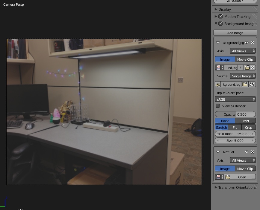With the sample blend file open, add your background image to the scene. In the 3D view window near the bottom right, locate "Background Images". Make sure this is checked, and click "Add image", then click "Open" and locate your background image from step 5 of data collection. Make sure your view is from the camera's perspective by pressing View->Camera (or View->Cameras->Active Camera); you should see your image in view.