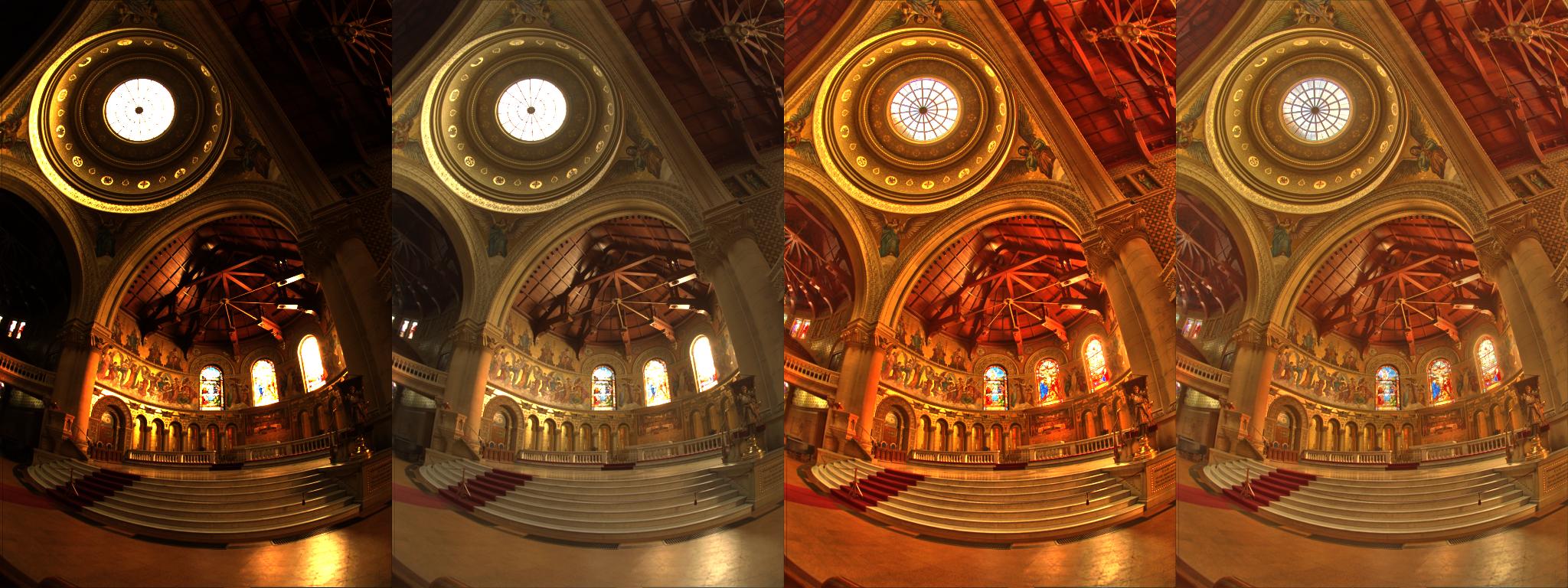 From left to right: simple rescaling, rescaling+gamma correction, local tonemapping operator, local tonemapping+gamma correction.