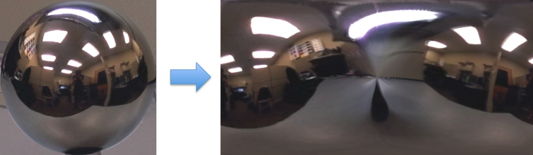 Now that we have an HDR image of the spherical mirror, we'd like to use it for relighting (i.e. image-based lighting). However, many programs don't accept the "mirror ball" format, so we need to convert it to a different 360 degree, panoramic format (there is a nice overview of many of these formats here). For this part of the project, you should implement the mirror ball to equirectangular (latitude longitude) transformation. Most rendering software accepts this format, including Blender's Cycles renderer, which is what we'll use in the next part of the project.